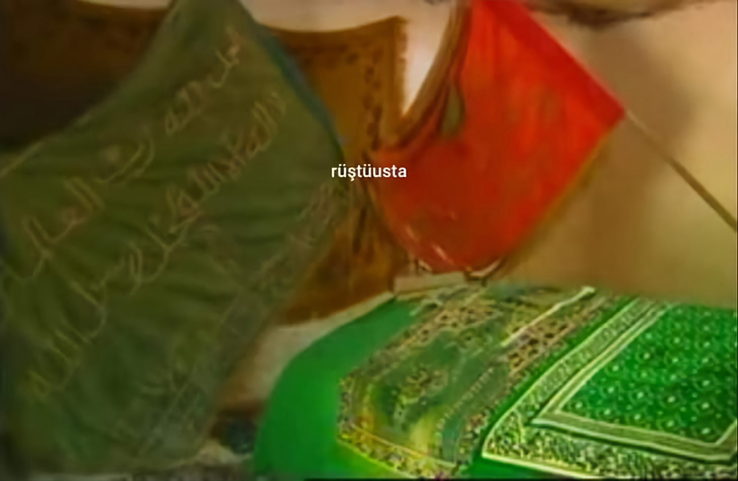 Türbede sergilenen sancaklardan yeşil renkli olanın üzerinde dört satırlık bir yazı; kırmızı renkli sancak üzerinde de üç satırdan oluşan bir yazı bulunmaktadır ve yazının aslı ve Türkçe okunuşu şöyle vermiştir.